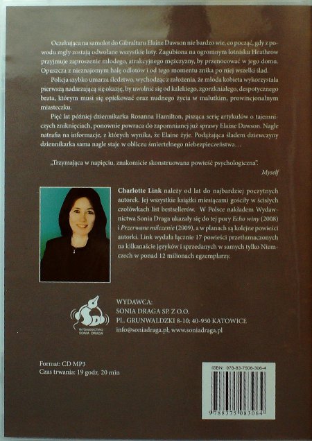 Ostatni ślad / Charlotte Link ; lektor Anna Maria Buczek. - Katowice : Wydawnictwo Sonia Draga, 2009. - 1 płyta CD (19 godz. 20 min.) : digital, stereo ; 12 cm ; Format MP3.