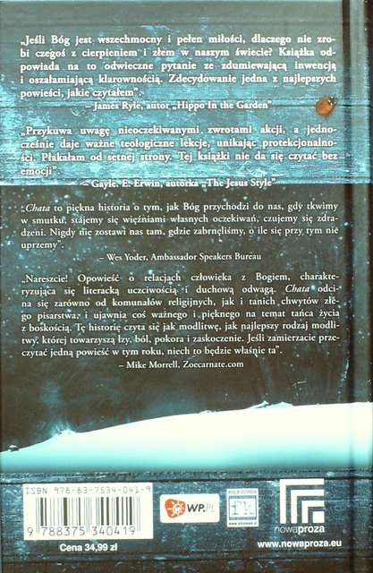 Tytuł: „Chata” Tytuł oryginału: „The Schack” Autor: William Paul Young Wydawnictwo: Nowa Proza Przełożyła: Anna Reszka Korekta: Urszula Okrzeja Opracowanie graficzne okładki: Piotr Chyliński Wydanie: III Oprawa: twarda Liczba stron: 294 Data wydania: 02.03.2017 ISBN: 978-83-7534-061-7 ** Źródło – Lubimy Czytać