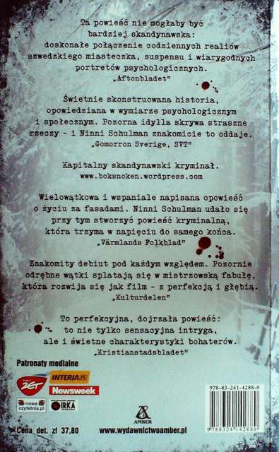 Ninni Schulman z zawodu dziennikarka, doskonale odzwierciedliła w powieści tak zwany wzór idealnego reportera. Magdalena Hansson, która po rozstaniu z mężem wraca do rodzinnego miasteczka Hagfors w szwedzkim regionie Värmland musi uporać się z przeszłością. Jej adoptowany syn tęskni za Sztokholmem, a ona sama nie zdołała jeszcze zapomnieć o nagłej decyzji męża. Główna bohaterka jako swój pierwszy art74554-dziewczyna-ze-sniegiem-we-wlosach-ninni-schulman-1ykuł w lokalnej gazecie opisuje śledztwo w sprawie morderstwa nieznanej nikomu dziewczyny. Czy owa zaginiona jest nastoletnią Heddą? Czy morderstwo ma do czynienia z handlem żywym towarem? Z początku akcja książki wydawała się powoli nabierać tępa. Owszem, powieść jest napisana w sposób, który nie pozwala nam odnaleźć zabójcy i dopiero pod koniec wszystko się wyjaśnia. „Człowiek myśli, że zna ludzi, a oni noszą w sobie takie tajemnice.” Denerwujący był jednak wątek policyjny w utworze. Ciągły brak poszlak, stanie w miejscu i brak dowodów. Przeciwko komu? Nawet tego nie wiadomo. Magdalena ze swoim otwartym na wszystko umysłem szybko doszła do prawdy. Nie powstrzymały jej nawet groźby słane w jej kierunku. Jak na mój gust książka jest zbyt mało brutalna i momentami po prostu nudna. Powieść nie wzbudza strachu, jest mało zaskakująca, lecz nie mogę powiedzieć, że zupełnie źle napisana. Znajdują się tu wątki, które u niejednej osoby mogą wywołać dreszcze, jednak są to według mnie nieliczne elementy.