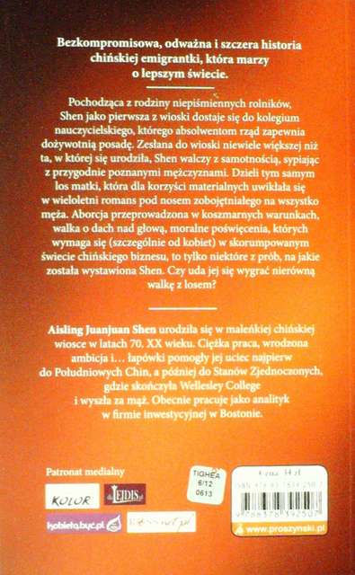 „Publishers Weekly” Aisling Juanjuan Shen urodziła się w maleńkiej chińskiej wiosce w latach 70. XX wieku. Ciężka praca, wrodzona ambicja i… łapówki pomogły Aisling uciec najpierw do Południowych Chin, a później do Stanów Zjednoczonych, gdzie skończyła Wellesley College i wyszła za mąż. Obecnie pracuje jako analityk w firmie inwestycyjnej w Bostonie.