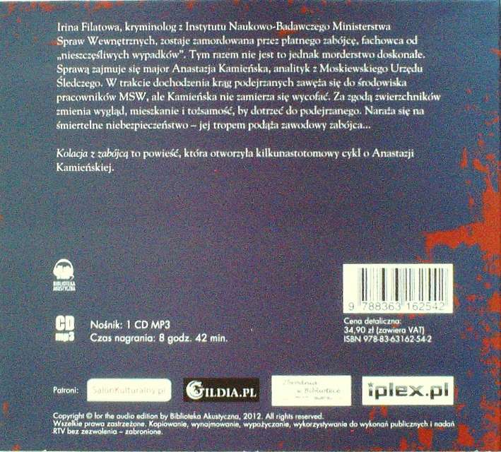 Kolacja z zabójcą / Aleksandra Marinina ; lektor Roch Siemianowski ; przekład Margarita Bartosik. - Warszawa : Biblioteka Akustyczna, 2012. - 1 płyta CD (8 godz. 42 min.) : digital; stereo ; 12 cm ; Format MP 3.