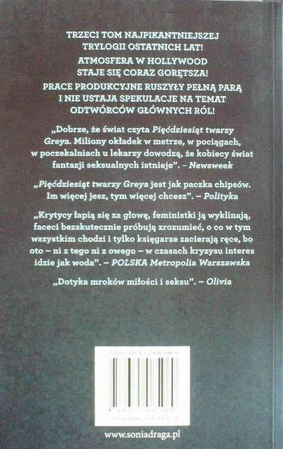 (...)Po powrocie do domu czas jednak zmierzyć się z rzeczywistością. Ana wraca do pracy, ale zapomina powiedzieć mężowi, że zostaje przy panieńskim nazwisku. Wybucha między nimi kłótnia, w której Anastasia musi się ugiąć pod naleganiami męża. Do państwa Greyów dociera także informacja o tym, kto podpalił firmę i prawdopodobnie zepsuł samolot Christiana. Prawda może okazać się zaskakująca… Anastasia kolejny raz otrzymuje rolę narratorki w powieści. Na początku jest nieco odmieniona. Jakby dojrzała, jej opowieść ma trochę inny styl. Potem wszystko wraca do znanej nam z dwóch poprzednich części normy. Młoda kobieta nie ukrywa przed czytelnikiem swoich myśli. Nie wszystkie z nich wypowiada na głos, dlatego dość ciekawie czyta się powieść, w której dialogi uzupełniane są przez głos z głowy Any. W porównaniu do pierwszej części poprawił się nieco język. Zrezygnowano z wtrętów związanych ze świętym, jest też mniej przekleństw. Dziewczyna odważniej się wypowiada, ale nie jest przy tym wulgarna. Akcja jest również bardziej dynamiczna. Nie skupia się tylko na seksie, są też rozmowy, ucieczka, wypadek, kłótnie… Duży plus, że główni bohaterowie wychodzą z sypialni i w końcu pokazują, że potrafią żyć też w innych miejscach. Główny minus? Christian. Nie rozumiem tego bohatera. Chce sprawować kontrolę nad swoją żoną nie tylko w sypialni. Chce, by była mu podporządkowana w każdym aspekcie życia. Nie może wyjść z koleżanką na drinka, nie może decydować o tym, czy chce nosić swoje nazwisko, nie może nawet pojechać swoim samochodem nigdzie. Dobrze, że nie wyznacza jej czasu, w którym może iść do toalety… Jest zaborczy i niesamowicie szybko się denerwuje, jest skryty i porywczy. Nie wiem, jak można z takim człowiekiem wytrzymać – mnie denerwował przy każdym zdaniu powieści. Anastasia także nie jest dobrze zarysowaną postacią. Jest odważna i czasem miałam wrażenie, że autorka chciała, by to właśnie Ana zbawiała świat swoim dobrem. Jest cierpliwa do granic możliwości. Przy okazji to seks bomba, mimo że sama uważa się za szarą myszkę. Ogólnie w tej części odchodzi się nieco od seksu, skupia się na problemach między dwójką młodych ludzi, którzy docierają się w małżeństwie. Jest dużo rozmów, choć mam wrażenie, że większość z tematów przewija się cały czas od nowa, a para nie dochodzi do porozumienia. Na końcu książki znajdziemy dodatek, który może przypaść do gustu czytelniczkom, które uwielbiają tę trylogię. Dwa krótkie wydarzenia opisane oczami Christiana. On jako dziecko i jego pierwsze spotkanie z Aną. Myślę, że to dobry wstęp do kolejnej książki o Greyu, która ma się pokazać niedługo. Ogólnie jest to raczej słabe zakończenie serii. Jest happy end, oczywiście, ale zbyt bajkowy. Wszyscy się ze sobą schodzą, są szczęśliwi, aż bolą zęby… no nie, kompletnie tego nie kupuję. Tak jak bardzo podobała mi się druga część, tak ta mnie znudziła. Miło, że odchodzi się od scen wyłącznie łóżkowych, ale tych nadal jest całkiem sporo. W końcu to erotyk. Polecam tym, którzy tak jak ja nie lubią mieć nieskończonej serii. Nie rozumiem fenomenu tej trylogii, bo moim zdaniem jest napisana dość płasko, nudno, schemat ciągle się powtarza… Ale cóż, może nie warto wymagać od tego typu literatury zbyt wiele?