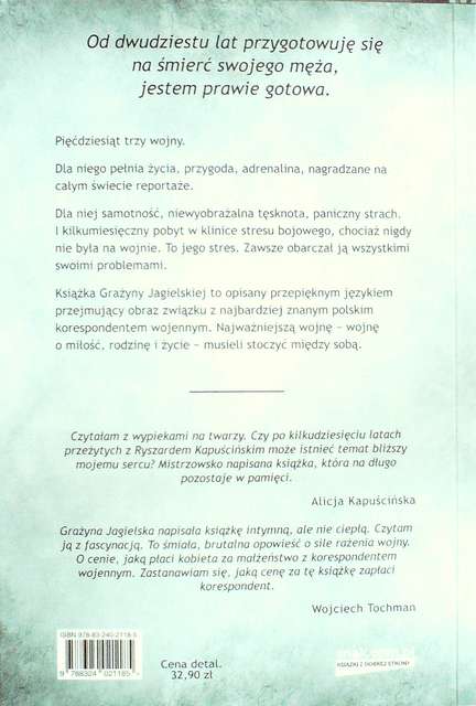 Książka Grażyny Jagielskiej to opisany przepięknym językiem przejmujący obraz związku z najbardziej znanym polskim korespondentem wojennym. (...) Najważniejszą wojnę - wojnę o miłość, rodzinę i życie - musieli stoczyć między sobą. gielska napisała książkę intymną, ale nie ciepłą. Czytam ją z fascynacją. To śmiała, brutalna opowieść o sile rażenia wojny. O cenie, jaką płaci kobieta za małżeństwo z korespondentem wojennym. Zastanawiam się, jaką cenę za tę książkę zapłaci korespondent. nota wydawcy