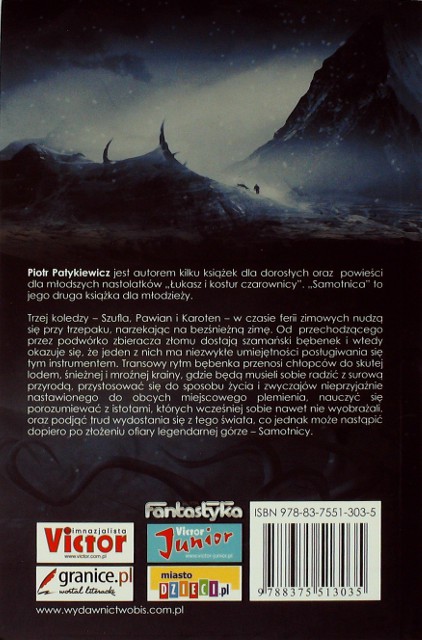 To, co okładka nam mówi o utworze: Trzej koledzy – Szufla, Pawian i Karoten – w czasie ferii zimowych nudzą się przy trzepaku, narzekając na bezśnieżną zimę. Od przechodzącego przez podwórko zbieracza złomu dostają szamański bębenek i wtedy okazuje się, że jeden z nich ma niezwykłe umiejętności posługiwania się tym instrumentem. Transowy rytm bębenka przenosi chłopców do skutej lodem, śnieżnej i mroźnej krainy, gdzie będą musieli sobie radzić z surową przyrodą, przystosować się do sposobu życia i zwyczajów nieprzyjaźnie nastawionego do obcych miejscowego plemienia, nauczyć się porozumiewać z istotami, których wcześniej sobie nawet nie wyobrażali, oraz podjąć trud wydostania się z tego świata, co jednak może nastąpić dopiero po złożeniu ofiary legendarnej górze – Samotnicy „To, co dla ciebie jest odpadkiem, dla kogoś innego może być skarbem.” Mimo iż bohaterowie nie mają wiele lat, są bardzo dojrzali (ech... to samo, co w większości książkach z młodzieżą). Pawian lubi się wygłupiać, Karoten uwielbia spać, jest przemądrzały, a Szufla jest wysoki i wysportowany.