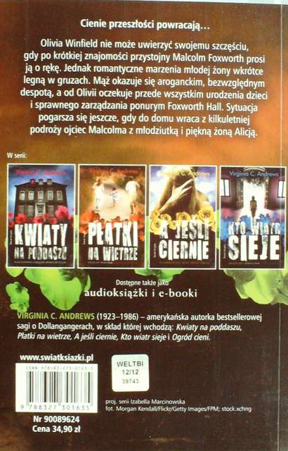 "Ogród cieni"stanowi Cz.5 Cyklu o Dollangangerach Cz.1"Kwiaty na poddaszu" Cz.2 "Płatki na wietrze" Cz.3"A jeśli ciernie" Cz.4"Kto wiatr sieje", Cz.6 "Pamiętnik Christophera : Tajemnica Foxworth Hall"