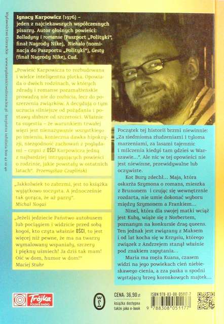 Jak zrozumieć człowieka, który wykasował profil na facebooku? Czy warto słuchać rad zachłannej tchórzofretki? Czy żona może polubić kochankę męża? W końcu - co może łączyć małżeństwo, gejowską parę, mężczyznę zupełnie pozbawionego owłosienia oraz kobietę o niejednoznacznej tożsamości? Wbrew pozorom - bardzo wiele… nota wydawcy "Jeżeli jedziecie Państwo autobusem lub pociągiem i widzicie przed sobą kogoś, kto czyta właśnie "ości", to jest więcej niż pewne, że ma na twarzy wymalowany wspaniały, szczery i piękny uśmiech! Ja dziś tak mam! Ość w dom, humor w dom!" Maciej Stuhr "Jakkolwiek to zabrzmi, jest to książka wyjątkowo soczysta. A jednocześnie tak gorąca, że aż parzy." Michał Nogaś