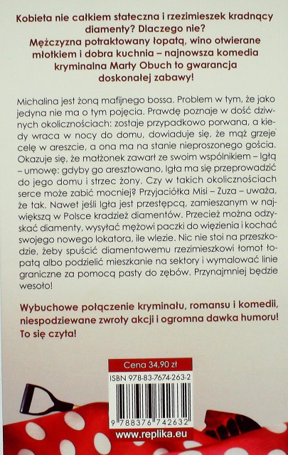 Główna bohaterka to Misia - Michalina Skoczylas - żona Henryka, który okazuje się mafijnym bossem. Dziewczyna nie miała o niczym pojęcia, do czasu kiedy małżonek trafia za kratki, (...) a ona sama jest uprowadzona! Żeby tego było mało, porywacz wkrótce okazuje się wspólnikiem Henryka, zwanego Hardym, i wprowadza się do Misi - żeby pilnować żony Hardego i... mieszkania! Na główny plan wychodzi również kradzież stulecia - diamentów! Na dokładkę autorka serwuje nam Zuzę - przyjaciółkę Michaliny, niziołka Marchewkę - policjanta, który prowadzi śledztwo i Ryszardę, zwaną Riczardą - kochankę. Jest to prawdziwa mieszanka wybuchowa!