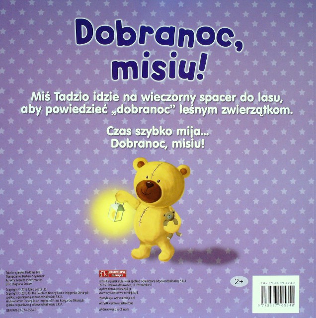 Dobranoc misiu / tł. Barbara Szymanek. - Ożarów Mazowiecki : Firma Księgarska Olesiejuk, 2013. - [8] s. : il. kolor. ; 30 x 30 cm.