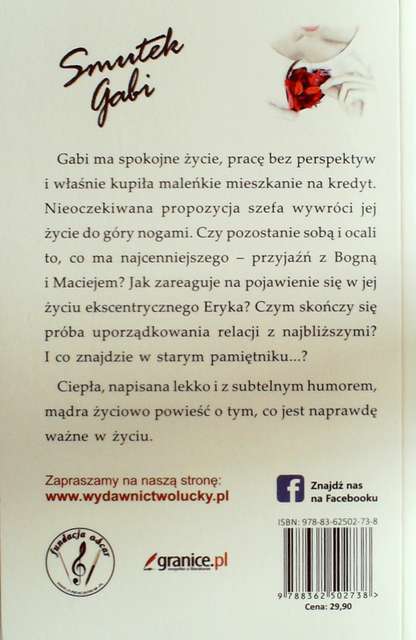 Zacznę od plusów tej lektury, chociaż ich jest zdecydowanie mniej. Podoba mi się, że w książce pojawia się kilka wątków, a nie wszystkie dotyczą bezpośrednio Gabi. Te historie w tle, w których w jakichś sposób uczestniczy główna bohaterka, są ciekawe i sprawiają, że powieść wydaje się bogatsza. Pozytywnie odbieram również postać Macieja, bo tylko on wydawał mi się bohaterem interesującym. Do plusów zaliczam też rozmiar książki i piękną okładkę.