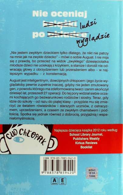 Rzeczonym głównym bohaterem jest August. Drobny dziesięciolatek, inteligentny i miły, ale charakteryzujący się swoim specyficznym wyglądem. Urodził się on bowiem z rzadką chorobą, przez którą lekarze nie dawali mu szans na przeżycie, a jego twarz od zawsze była potwornie zniekształcona. Jednak cud sprawił, że Auggie dotrwał do dziesiątego roku życia, uczony w domu przez mamę i nadopiekuńczo chroniony przed rówieśnikami przez siostrę Vię. Jak można się domyślić, chłopiec jest dość dziecinny, ale nawet jeśli ktoś twierdzi, że mu to przeszkadza, gwarantuję, że charakter głównego bohatera jest wielkim plusem dla całej historii.