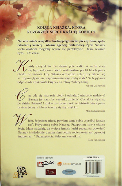 „Jeszcze raz, Nataszo”, jest pierwszą książką autorki, którą mogłam przeczytać. Pierwszą i z pewnością nie ostatnią. Książka opisuje piękną lecz jakże trudną historię, dosłownie czujemy to co główna bohaterka przeżywa w danym momencie, ból, zdradę, samotność, rozpacz, żal. Powieść przedstawia nam wartości, którymi człowiek się zazwyczaj kieruje, a którymi powinien się kierować. Nie ważny jest pieniądz lecz ludzie i to co sobą reprezentują. Przechodzimy przez koniec komunizmu, a początek kapitalizmu, widzimy jak wtedy było, co się działo, jak ludzie byli traktowani. Autorka ma lekkie pióro dlatego wydaje się, że przez książkę płynęłam. Nie żałuję ani chwili spędzonej z książką. Żałuję jedynie tego, że cała opowieść się skończyła. Warto też wspomnieć o przepięknej okładce, która przyciąga wzrok jak magnes. Z pewnością nikt, nie przejdzie koło niej obojętnie. Warto sięgnąć. Polecam!