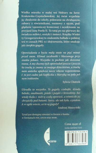 Guguły to inaczej niedojrzałe owoce. I choć utwór Wioletty Grzegorzewskiej nosi tytuł o tak metaforycznym znaczeniu, w całej swej skromnej okazałości jest opowieścią nad wyraz dojrzałą, o dojrzewaniu również mówiącą. To zbiór króciuteńkich opowiadań, które mogłyby ze spokojem bardzo dobrze funkcjonować osobno, ale razem tworzą jedną dość spójną całość, ukazując życie Wiolki, zamieszkującej wieś Hektary na Jurze Krakowsko-Częstochowskiej. (...) Jej życie jest raczej zwyczajne. Śledzimy losy bohaterki od okresu dzieciństwa, po czas bycia dzieckiem i koniec końców jako nastoletniej panny. Jak to na wsi bywa na kartach tejże opowieści opisane zostały szkolno-podwórkowe perypetie z elementami rodzinnych historii w tle. Obecne są tu zabawy z rówieśnikami, obchody świąt różnorakich i adoracji, oczekiwanie na przyjazd Jana Pawła II, są wesela, są pogrzeby, nadal funkcjonujące stereotypy, momentami ciągle żywe zabobony, trochę tu także erotyki wszelkiego rodzaju. „Guguły” to słodko-gorzki obraz dojrzewania w czasach PRL-u, bez niedopowiedzeń.