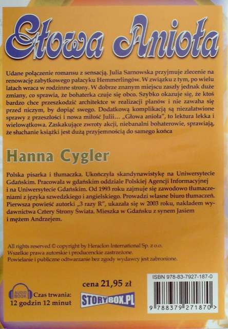 Głowa Anioła / Hanna Cygler ; lektor Hanna Kinder-Kiss. - Piaseczno : Heraclon International - Storybox.pl, [2015]. - 1 płyta CD (12 godz. 12 min.) : digital stereo ; 12 cm ; Format MP3.
