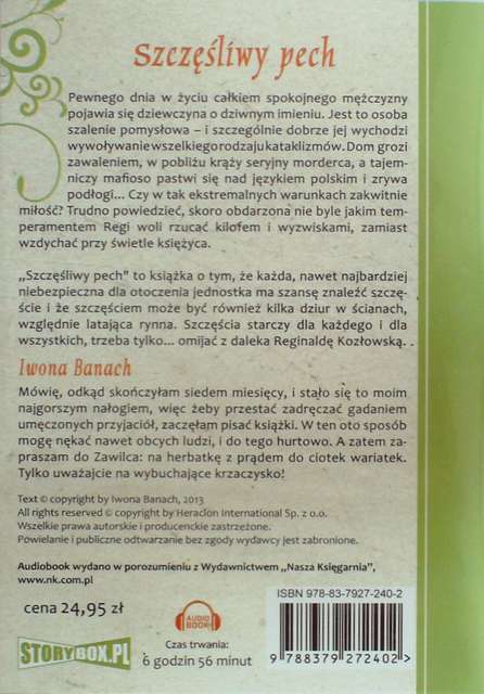 Szczęśliwy pech / Iwona Banach ; lektor Magda Karel. - Piaseczno : Heraclon International - Storybox.pl, 2013. - 1 płyta CD (6 godz. 56 min.) : digital stereo ; 12 cm ; Format MP3.