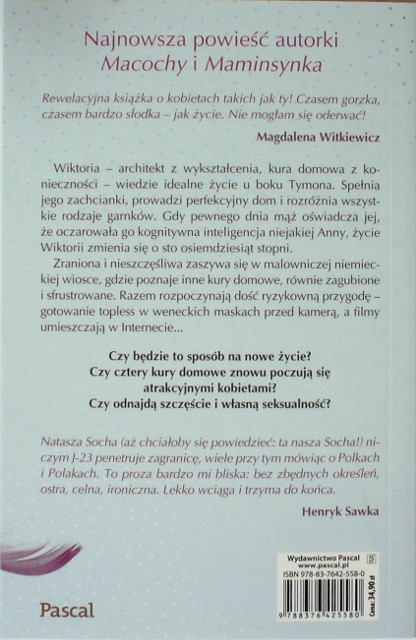 (...)Może się też czołgać.” Czy oglądaliście kiedyś program Małgorzaty Rozenek „Perfekcyjna pani domu”? Jest to reality show, w którym idealna gospodyni pomaga uczestniczkom programu w ogarnięciu nieładu jaki zapanował w ich domach, dąży do tego, aby te gospodynie stały się perfekcyjnymi w każdym calu. Natomiast Natasza Socha w swojej książce ukazała jak do tej perfekcyjności się dochodzi i uwierzcie mi, że to nie będzie droga usłana różami. Dla wielu kobiet jest to historia boleśnie prawdziwa... Wiktoria to 37 letnia kobieta, bardzo inteligentna i wykształcona, bowiem ukończyła architekturę z wyróżnieniem lecz nie było jej dane pracować w zawodzie ponieważ mąż skutecznie jej to wyperswadował. Ona ma się zajmować domem, a on będzie zarabiał na utrzymanie. Typowe. Po dwunastu latach „udanego” małżeństwa Tymon oznajmia Wiktorii, że odchodzi do innej, do kobiety, która „przetwarza informacje na poziomie abstrakcyjnych idei”. Co teraz ma począć Wiktoria, która przez całe dorosłe życie nie pracowała w zawodzie i była utrzymywana przez męża? Upokorzona i zraniona postanowiła zostawić przeszłość za sobą w Polsce. Tym samym zdecydowała się na wyjazd do jedynej osoby, która wyciągnęła do niej rękę - ciotki Klary od kilkunastu lat mieszkającej w Niemczech. „(...) - Co to ukurzenie? (…) - To rodzaj pewnego procesu, który następuje stopniowo, dlatego trudno się tak od razu zorientować. Najpierw są normalne wymagania, których oczekuje się od kobiety, czyli pranie, sprzątanie, gotowanie i pieczenie. W późniejszym etapie dorzucane są kolejne czynności: szycie, dzierganie, robienie na drutach, cerowanie, prace ogrodowe, w tym nawet samodzielne zakładanie oczka wodnego. Kobieta wszystkiego się uczy, bo wychodzi z założenia, że jest to absolutnie niezbędne do normalnego funkcjonowania domu. Proces ukurzenia dodatkowo wzmagają zakazy dbania o urodę, czyli malowania się, farbowania włosów, a nawet golenia nóg.” Wiktoria po niedługim czasie doszła do siebie, wtedy też zaczęła wychodzić z domu, zwiedzać okolice. Tym sposobem poznała trzy kobiety, z którymi po pewnym czasie się zaprzyjaźniła. Wiktoria, Judith, Mara i Lea wszystkie zdecydowanie różnią się od siebie charakterami i wyglądem lecz połączyło je jedno, a mianowicie to, że wszystkie zostały „ukurzone”. Błyskotliwe i wykształcone dały się zniewolić przez swoich mężów - obecnych czy byłych. Mężczyźni chcieli piąć się po szczeblach kariery, zarabiać duże pieniądze, a wracając do domu oczekiwali, że perfekcyjna pani domu (czytaj żona) zadba o ich cały dobytek (nie koniecznie o wspólny, bo przecież to mąż zarabia, a żona „siedzi” w domu”). Wszystkie te panie w mgnieniu oka znalazły wspólny język i nawiązały przyjaźń, dostrzegły jak bardzo ich życie jest podobne, zaczęły pragnąć czegoś więcej jak tylko siedzenie przy garach i mopie. Znalazły swój własny sposób na szczęście, zaczęły rozwijać swój własny biznes... „Dobry przyjaciel to ktoś, komu można powierzyć największe tajemnice bez obaw, że zostaną one zdradzone czy też wyśmiane. Ktoś, kto wysłucha, przemyśli problem, zastanowi się i będzie próbował pomóc. Ktoś, kto nie zbagatelizuje sprawy i nie machnie ręką na kłopoty drugiej strony. Kobiety chcą mówić i chcą być wysłuchane. To ułatwia im podejmowanie decyzji, daje możliwość poznania siebie samych, zmniejsza skutki uboczne codziennych kłopotów, podnosi własną wartość.” Niezmiernie się cieszę, że mogłam przeczytać tę publikację w dodatku przedpremierowo. Jest to książka niebanalna, nietuzinkowa, przy której nie będziecie się nudzić. Nie znajdziecie tutaj sztucznych dialogów, książka przedstawia historię jak wyrwaną z czyjegoś życia, bardzo prawdziwą, autentyczną, taką, która przytrafiła lub może przytrafić się właśnie tobie. Moja przygoda z twórczością Nataszy Sochy zaczęła się od „Maminsynka”, który to bardzo przypadł mi do gustu. Oczekiwałam tego samego po „Rosół z kury domowej”, a otrzymałam dużo więcej niż przypuszczałam. Socha nie zawiodła mnie ponownie, udowodniła, że świetnie potrafi władać piórem, uwielbiam jej styl pisania, dla mnie pod tym względem jest mistrzynią, niewiele polskich autorek potrafi w taki cudowny sposób „bawić się słowem”. Autorka jak zwykle nie owija w bawełnę, nie słodzi, pisze samą prawdę, jest doskonałą obserwatorką. Publikację czyta się w zastraszającym tempie z wielkim zainteresowaniem. Czytelnik bardzo szybko przenosi się w wykreowany przez autorkę świat. W książce można znaleźć przydatne porady dotyczące sprzątania, a także kilka przepisów kulinarnych. Oprawa graficzna jest bardzo ciekawa, tym bardziej, że modelką jest sama autorka. Całość starannie dopracowana. Znacie ten stan kiedy czytelnik po zakończeniu lektury jest usatysfakcjonowany lecz ciągle mu mało? Znalazłam się w takiej sytuacji, ponieważ z przyjemnością przeczytałabym powieść z dalszymi losami bohaterek. „ - Dlaczego kura? - koniecznie chciała wiedzieć Judith. - Dlaczego nie kaczka albo w ogóle jakieś inne zwierzę? No właśnie. - Może dlatego, że życie kury jest w sumie dość nudne. Dziobanie, oddanie kupra kogutowi, wydalenie jaj.(..)” Kandydatki na żonę (kurę domową) przeczytajcie tę książkę, abyście mogły się przygotować na to co może was spotkać oraz byście mogły się przed tym uchronić. Żony, powinnyście domagać się szacunku. Mężczyźni, mężowie spójrzcie na nasz - kobiet - punkt widzenia. Przeczytajcie konieczne tę pozycję, bo daje do myślenia. Generalnie polecam ją każdej osobie jestem pewna, że po jej lekturze z pewnością sięgniecie po kolejne książki autorki. Polecam. Na koniec wstawiam fragment, który wytłumaczy co niektórym osobom pojęcie „si