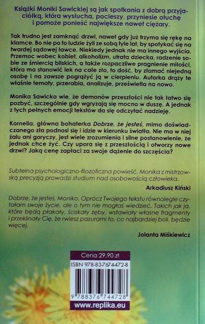 Moja opinia: Patrząc na okładkę tej książki można by się spodziewać lekkiej i przyjemniej lektury. Jakże mylne wrażenie. Książka Moniki Sawickiej zdecydowanie nie jest lekka. Jest to moja pierwsza książka Moniki jaką miałam okazję przeczytać. Trafiła do mnie kompletnie przez przypadek. Wziełam udział w konkursie, w którym brało udział bardzo wiele osób i nie myślałam, że mi się uda. Udało się jednak. Myśle, że to los chciał aby ta książka do mnie trafiła. Lektura ta porusza bardzo wiele trudnych tematów. Trudne dzieciństwo, przemoc domową, Borderline, DDA czy śmierć dziecka. Tak jak zawsze mówie: "Gdy kobiecie umiera dziecko, umiera i część niej samej." Jednak bohaterka cały czas stara się być silna. Książka przepełniona jest wieloma metaforami czy filozoficznymi myślami. Tak jak mówiłam nie jest to łatwa lektura i zdecydowanie nie dla każdego. W trakcie czytania trzeba myśleć, analizować. Podoba mi się też sposób napisania książki, który możemy podzielić na trzy. Narracja, listy oraz dziennik. Dodatkowego uroku lekturze nadają wiersze Kaji Kowalewskiej, które sięgają dna duszy każdego z nas. Podoba mi się też fakt, że autorke inspirują polscy piosenkarze. Ich piosenki również można znaleść w książce. Monika odwołuje się min. do takich artystów jak Maryla Rodowicz, Andrzej Piaseczny czy Edyty Gepert. Dodatkowym atutem na powno jest też fakt, że w lekturze można odnaleść informacje czym jest DDA czy toksyczny związek. Myśle, że takie informacje mogą być dla wielu osób przydatne. Podsumowując. Piękna okładka skrywająca "brzydką" historie, która napawa nadzieją na lepsze jutro. Książka nie dla każdego. Tylko wyrafinowany czytelnik szukający wymagającej i nieszablonowej książki odnajdzie w niej to co skrywa pięknego. Mnie urzekła. Zachwyciła.