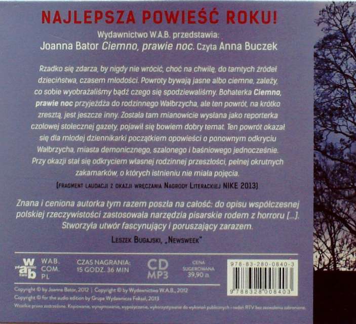 Ciemno prawie noc / Joanna Bator ; lektor Anna Buczek. - Warszawa : Grupa Wydawnicza Foksal, 2013. - 1 płyta CD (15 godz. 36 min.) : digital stereo ; 12 cm ; Format MP 3.