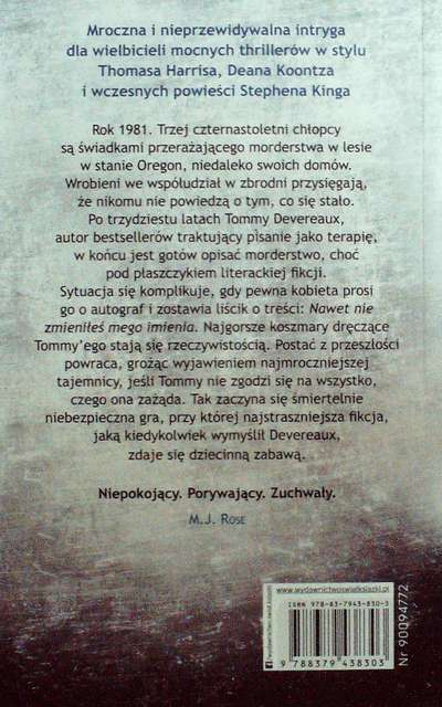 Po trzydziestu latach Tommy Devereaux, autor bestsellerów traktujący pisanie jako formę terapii, w końcu jest gotów, pod płaszczykiem fikcji literackiej, opisać tamto morderstwo. Sytuacja komplikuje się, gdy pewna kobieta prosi go o autograf i zostawia liścik o treści: Nawet nie zmieniłeś mego imienia. (...) Najgorsze koszmary dręczące Tommy'ego stają się rzeczywistością. Postać z przeszłości powraca, grożąc wyjawieniem mrocznej tajemnicy.