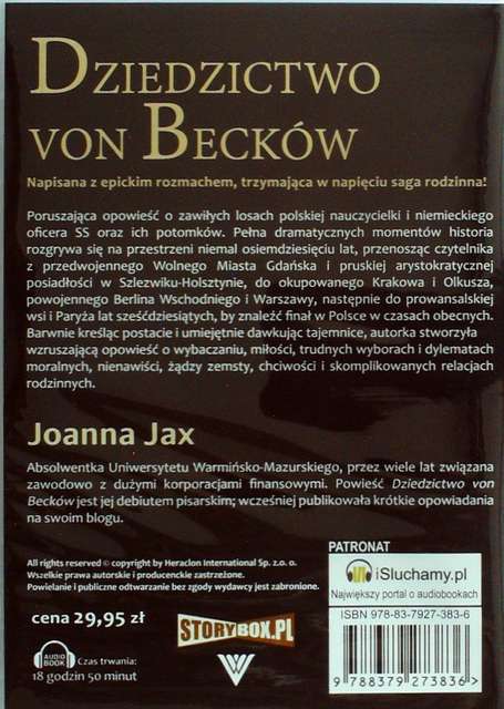Dziedzictwo von Becków / Joanna Jax ; lektor Elżbieta Kijowska. - Piaseczno : Heraclon International - Storybox.pl, 2015. - 1 płyta CD (18 godz. 50 min.) : digital stereo ; 12 cm ; Format MP3.