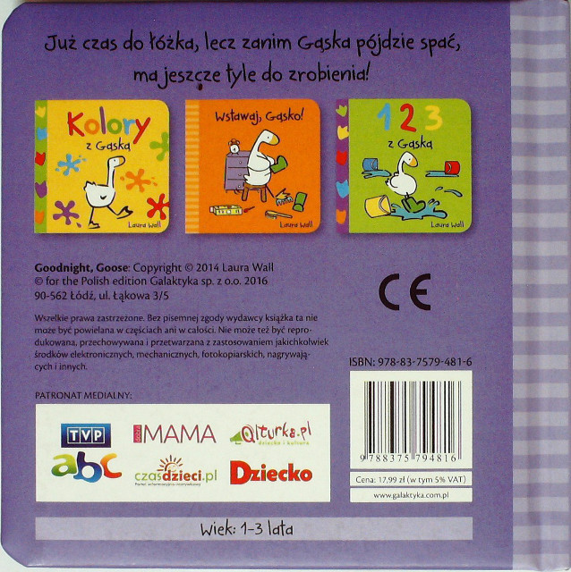Dobranoc Gąsko / Laura Wall. - Łódź : Galaktyka, 2016. - [16] s. : il. kolor. ; 17x17 cm.