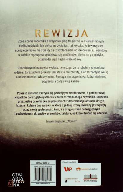 (...)że ja nie chcę przez połowę swojego życia czytać tylko Mroza. Jestem jego fanem, ale jest mnóstwo książek, które również chcę poznać. Dlatego dopiero teraz sięgam po trzeci tom. W dość okrutny sposób giną córka i żona pewnego robotnika. Ich polisa na życie jest tak ogromna, że ubezpieczyciel nie za bardzo spieszy się z wypłatą pieniędzy, a poza tym ów robotnik szybko zostaje oskarżony. No bo przecież zrobił to dla pieniędzy z polisy. Tym bardziej, że pojawiają się dowody… Wyjść z opresji pomaga mu pewna znana prawniczka. Spośród trzech pierwszych tomów tej serii, „Rewizja” jest najgorsza, ponieważ akcja tego utworu ani nie biegnie na łeb na szyję, ani nie trzyma mocno w napięciu. Wprawdzie szybko mi się ją czytało i byłem ciekawy zakończenia, które, nawiasem mówiąc, jest dobre, ale w porównaniu z Kasacją czy Zaginięciem wypada blado. Autor posługuje się prostym i lekkim językiem. Pojawiają się wulgaryzmy (oczywiście nie bez powodu), ale nie zostały one nadużyte. Książka porusza problem nietolerancji i uprzedzeń wobec Romów. Bardzo dużo osób nie toleruje tej grupy etnicznej, często oskarżając ich o coś, np. kradzież czy morderstwo, bo są Cyganami. Remigiusz Mróz przybliża troszkę ich historię (szczerze powiem, że na ich temat nie wiedziałem nic, bo nigdy jakoś się nimi nie interesowałem). Jest to jeden z ciekawszych wątków Rewizji. Wadą tej książki są dwie naciągane sytuacje. Mam na myśli moment spotkania Chyłki z Żelaznym. To spotkanie jest dość dziwne, a jego przebieg jeszcze dziwniejszy. Decyzja jaką Artur podejmuje jest do niego niepodobna i ja tego nie kupuję. Nie mogę wam powiedzieć dokładnie o co mi chodzi, bo byłby to spoiler. Druga sytuacja rozegrała się pod koniec utworu. Wtedy Chyłka spotkała się z pewnym jegomościem. Wynik tego spotkania jest nieprawdopodobny. Kasację i Zaginięcie czytało mi się szybko i nie mogłem się od nich oderwać. Odniosłem wrażenie, że w Rewizji ta cała sprawa morderstwa zeszła gdzieś na bok, a na pierwszy plan wysunęły się wątki obyczajowe, które nie ukrywam trochę mnie nużyły. Zakończenie utworu jest świetne i nie mogę się doczekać, aż sięgnę po czwarty tom, ale za bardzo nie zmienia ono tego, co myślę na temat tej powieści. Chyłka, którą uwielbiałem ponad wszystko i uważałem za najlepszą bohaterkę spośród wszystkich, stała się irytującą alkoholiczką, która utraciła swoją klasę i profesjonalność. Oczywiście nadal jest ona chamska, ma niewyparzony język i zawsze musi mieć ostatnie zdanie. Jestem zły, że Remigiusz Mróz zniszczył to, co było najlepsze w tej serii. Nierealne jest to, że ktoś chciałby, aby taka osoba broniła go. Minusem utworu też jest to, że na temat życia prywatnego Kordiana jest mało informacji, a o Joannie wie się więcej, a przecież to ona jest postacią, która broni swojej prywatności. Coś tu nie gra. Uważam, że relacja Zordona i Chyłki została słabo przedstawiona. Natomiast postać Langera jest plusem, bo nadaje tajemniczości, a niekiedy wywołuje dreszcze. To taki dodatkowy smaczek. Podsumowując, trochę jestem zawiedziony. Spodziewałem się świetnego thrillera prawniczego, a dostałem utwór, który jest dobry, ale nie zachwyca. Źródło – Lubimy Czytać