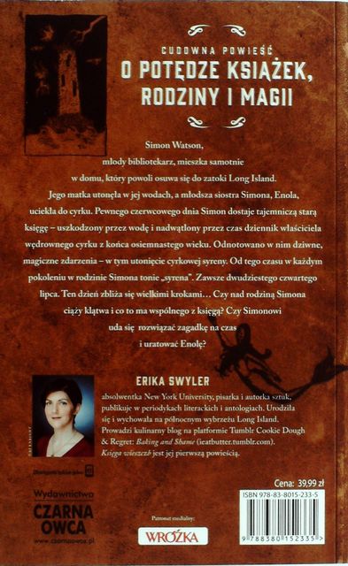 Tytuł: „Księga wieszczb” Tytuł oryginału: „The Book of Speculation” Autor: Erika Swyler Wydawnictwo: Czarna Owca Projekt okładki: Anna Gorovoy Adaptacja okładki: Magdalena Zawadzka Korekta: Maciej Korbasiński, Beata Wójcik Wydanie: I Oprawa: miękka Liczba stron: 406 Data wydania: 15.06.2016 ISBN:978-83-8015-233-5 Źródło – okładka.