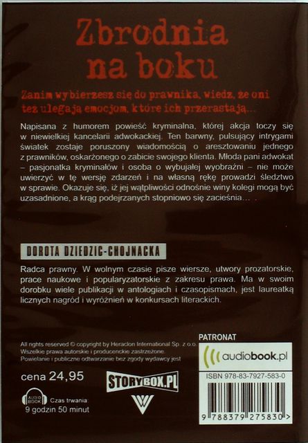 Zbrodnia na boku / Dorota Dziedzic-Chojnacka ; lektor Joanna Domańska. - Piaseczno : Heraclon International - Storybox.pl, [2016]. - 1 płyta CD (9 godz. 50 min.) : digital stereo ; 12 cm ; Format MP3.