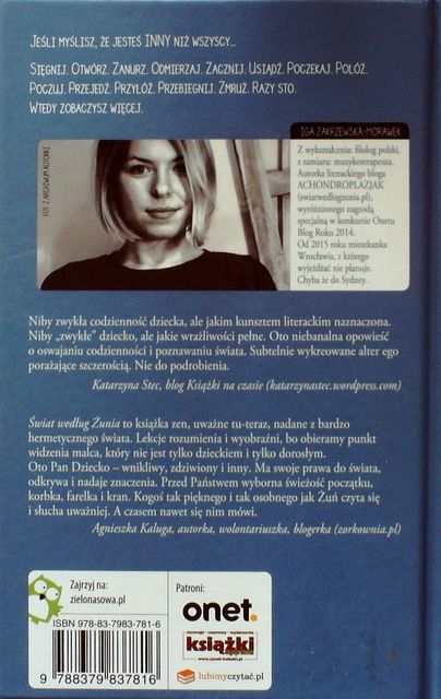 Tytuł: „Świat według Żunia” Autor: Iga Zakrzewska-Morawek Wydawnictwo: Zielona Sowa Ilustrowała: Dominika Cierplikowska Projekt okładki: Dominika Cierplikowska Korekta: Jadwiga Przeczek Wydanie: I Oprawa: twarda Liczba stron: 176 Data wydania: 16.03.2016 ISBN: 978-83-7983-781-6 Źródło – okładka książki.