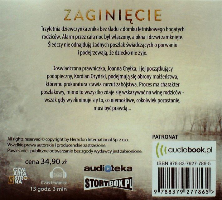Nic dobrego nie może wróżyć nagły telefon od znajomego, niewidzianego od wielu lat. Zwłaszcza, jeżeli dzwoni późną nocą. Jedynym rozsądnym rozwiązaniem w takiej sytuacji wydaje się szybkie zakończenie rozmowy i wyłączenie telefonu. Joanna Chyłka tak jednak nie czyni. Nie dość, że wysłuchuje drugą stronę do końca, to na dodatek godzi się zostać jej obrońcą. Pewnej nocy ze swego pokoju znika kilkuletnia dziewczynka.