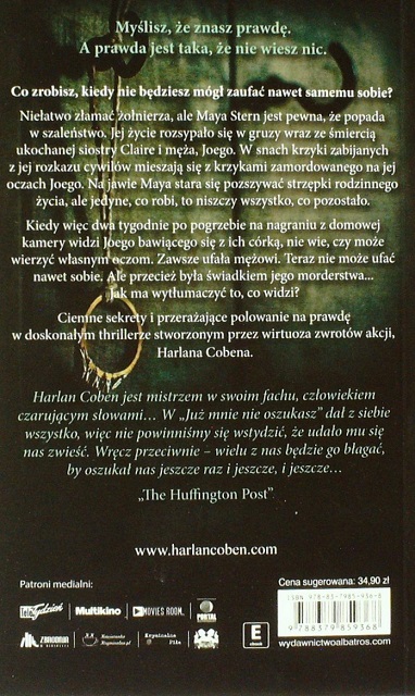 "Już mnie nie oszukasz". Noo, przewrotny tytuł. Daje się takiemu czytelnikowi z początku średnio zrywną, ale generalnie rozwojową historię. Nie dochodzimy jeszcze do połowy, a już na kilometr śmierdzi intrygą. Podkładane są jak bierwiona do ognia kolejne postacie - podejrzanie dobre, podejrzanie uśmiechnięte, podejrzanie miłe, podejrzanie niepodejrzane. Instynktownie włącza się w czytelniku wewnętrzny Sherlock Holmes, który po to na stronie dwudziestej uśmiecha się do samego siebie, znając rozwiązanie zagadki, by na siedemdziesiątej zmrużyć oczy, nie rozumiejąc już nic. Wodzony przez główną bohaterkę po jej własnych wątpliwościach i domysłach, podąża za nią krok w krok, czasem stając nagle i mówiąc - głupiaś, przecież to jasne!... - by dotrzeć wreszcie do ostatnich stron i mocno, naprawdę mocno się zdziwić. Bo nawet jeśli w którymś momencie wskaże się trafnie winnego, to, by zrobić to nieprzypadkowo, po prostu potrzeba garści informacji, które autor przez niemal całą książkę postanawia zachować dla siebie. Tak o, do czasu, kiedy nie chce odwrócić akcji o kilkadziesiąt stopni. Sprytnie.