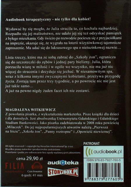 Szkoła żon / Magdalena Witkiewicz ; lektor Agnieszka Wagner. - Piaseczno : Heraclon International - Storybox.pl, 2017. - 1 płyta CD (6 godz. 41 min.) : digital stereo ; Format MP 3 ; 12 cm.
