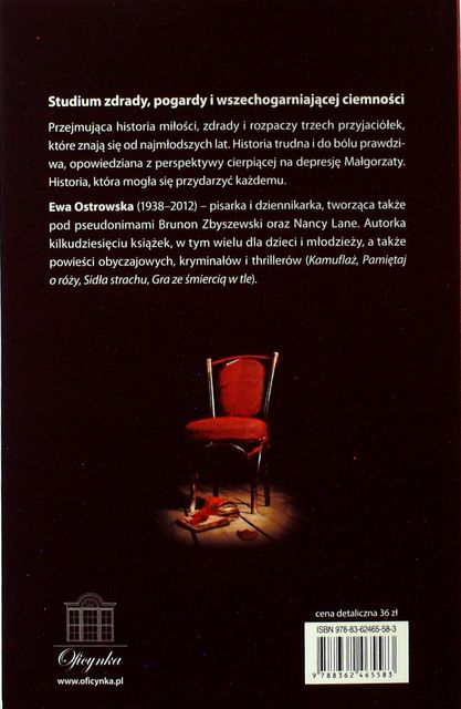 Tytuł: „O zmierzchu” Autor: Ewa Ostrowska Wydawnictwo: Oficynka Projekt okładki: Anna Damasiewicz Wydanie: I Oprawa: miękka Liczba stron: 321 Rok wydania: 2017 ISBN: 978-83-62465-58-3 Źródło – okładka książki.