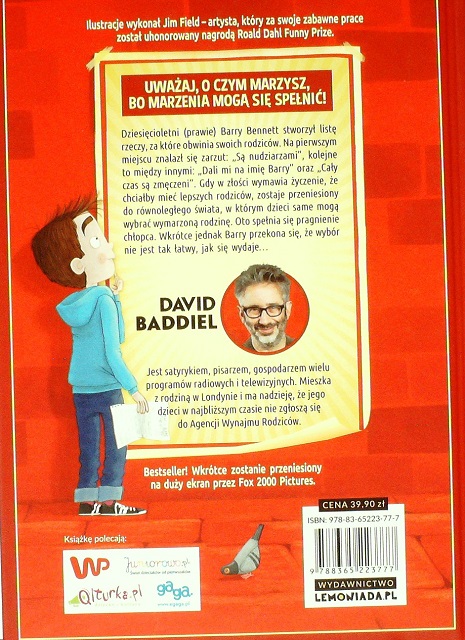 Powieść Agencja Wynajmu Rodziców napisał David Baddiel, brytyjski komik, powieściopisarz i prezenter telewizyjny. Akcja jest szybka i wartka, a wydarzenia zaskakujące. Powieść jest zabawna, momentami refleksyjna. Książkę przetłumaczyła z angielskiego Agnieszka Karus.