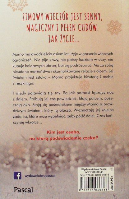 Zimowy wieczór jest senny, magiczny i pełen cudów. Jak życie… Momo ma dwadzieścia osiem lat i żyje w gorsecie własnych ograniczeń. Nie pije kawy, nie patrzy ludziom w oczy, nie kupuje kolorowych ubrań, boi się podróżować. Ma za sobą nieudane małżeństwo i skomplikowane relacje z ojcem. Jej światem jest sztuka – Momo projektuje biżuterię i meble z recyklingu. (...)