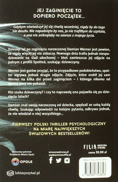 Moje pierwsze spotkanie z twórczością Remigiusza Mroza i muszę przyznać że trochę udane i trochę jestem rozczarowana. Dziesięć lat po zaginięciu ukochanej Damian Werner stara się pogodzić z tym, że już nigdy jej nie zobaczy. Pewnego dnia trafia niespodziewanie na znak od ukochanej - ktoś umieszcza jej zdjęcie w internecie. Kto szuka dziewczyny? Co się z nią działo przez tyle lat? I jaka prawda ukrywa się pod zdjęciami?