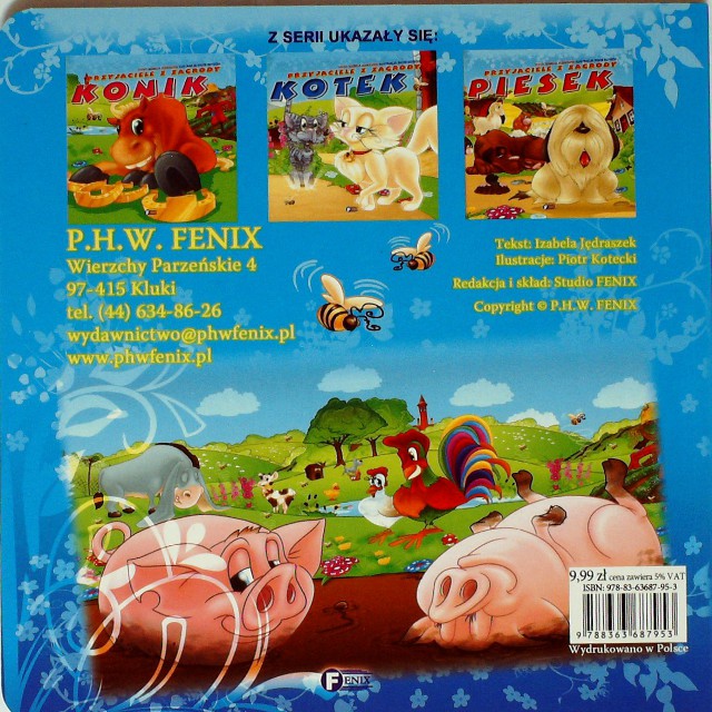 Świnki / tekst Izabela Jędraszek ; il. Piotr Kotecki. - Wierzchy Parzeńskie : P.H.W. FENIX, [2013]. - [10] s. : il. kolor. ; 19 x 19 cm.