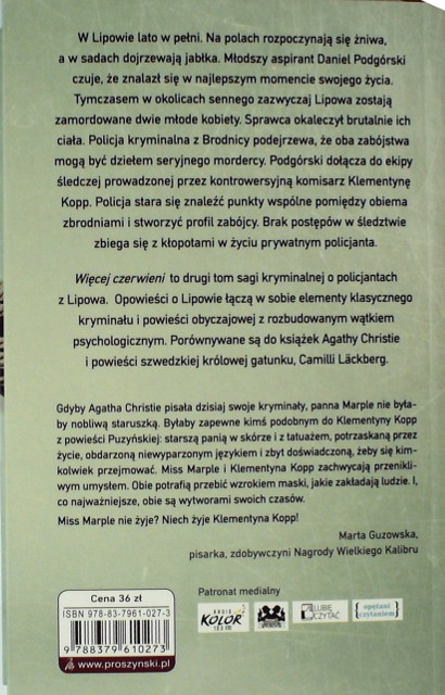 Podsumowując "Więcej czerwieni" to bardzo dobrze napisany kryminał. Dynamiczny, pełen zwrotów akcji, gęstej atmosfery, zapewniający czytelnikowi moc wrażeń. Lipowo wciąga, a ja już odmierzam czas, kiedy znów odwiedzę tę malowniczą miejscowość.