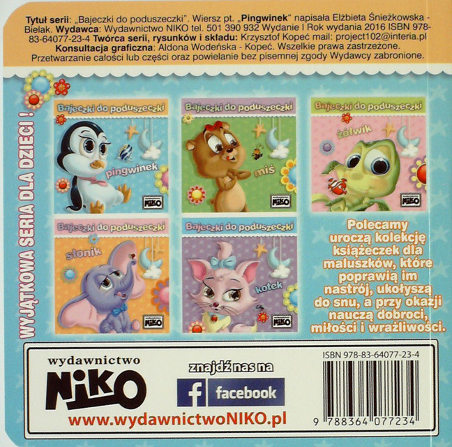 Pingwinek / Elżbieta Śnieżkowska-Bielak ; il. Krzysztof Kopeć. - Kijewo Królewskie : Wydawnictwo NIKO, 2016. - [10] s. : il. kolor. ; 15x15 cm.