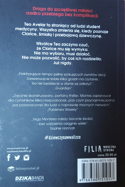 (...)by napisał historię miłosną. Zrobił, o co prosiła, tyle że w dość nietypowy sposób… Dziewczyna w walizce ukazała się dotąd w 13 krajach.* Teo Avelar jest studentem medycyny, który trzyma się z dala od ludzi. Niespodziewanie poznaje Clarice, która zmienia jego całe życie. Wie, że ona nie czuje tego samego, co on. Nie może dopuścić, aby ktoś ją jej zabrał. Co zrobi? Sięgnąłem po tę książkę, bo z opisu wiedziałem, że nie będzie to zwykły thriller; taki, jakich jest pełno. Była to jedna z lepszych książkowych decyzji, jakie podjąłem w tym roku. Autor posługuje się lekkim językiem, dzięki czemu bardzo szybko czyta się ten utwór. Od samego początku jest tajemniczo, intrygująco i trochę mrocznie. Akcja pędzi na łeb na szyję i trzyma w napięciu do samego końca, są intrygi. „Dziewczyna w walizce” to mocna, lekko psychopatyczna książka, którą trzeba zrozumieć, aby polubić, a to nie jest takie proste. Dużym plusem tej powieści jest oryginalność. Takiej książki jeszcze nie było. Pomysł został dopracowany w nawet najmniejszym szczególe. Wątek romantyczny odgrywa tutaj pierwsze skrzypce. Jest on główną osią fabularną, bez niego nie byłoby tej fantastycznej książki. Bardzo mi się on spodobał, gdyż autor przemyślał to, co chce zrobić. Teo to osoba wyalienowana ze środowiska studenckiego. Nie ma kolegów, ciągle jest sam, oszukiwał matkę, że spotyka się z dziewczynami, aby nie pomyślała, iż jest homoseksualistą, co byłoby nieprawdą. Polubiłem go, gdyż jestem do niego podobny (z charakteru), dlatego trochę go rozumiem, ale nie usprawiedliwiam podjętych przez niego decyzji. Na podstawie anatomicznej budowy ciała jest w stanie powiedzieć na temat danej osoby prawie wszystko. Clarice jest odważną dziewczyną, którą lubi wiele osób. Jest piękna, inteligentna i trochę nieogarnięta. Ma ambitne plany, które realizuje małymi krokami. Lubi się dobrze bawić. Polecam wam tę książkę, ponieważ jest to jedna z najlepszych książek, jakie przeczytałem w tym roku. Za przekazanie egzemplarza do recenzji dziękuję Księgarni Tania Książka. Książkę można kupić tam za 31,92 zł. Tytuł: „Dziewczyna w walizce” Tytuł oryginału: „Dias Perfeitos” Autor: Raphael Montes Wydawnictwo: FILIA Mroczna Strona Przełożył: Jacek Konieczny Projekt okładki: Magdalena Kuc Korekta: SEITON Wydanie: I Oprawa: miękka (ze skrzydełkami) Liczba stron: 356 Data wydania: 15.06.2016 ISBN: 978-83-8075-105-7 Źródło – książka.