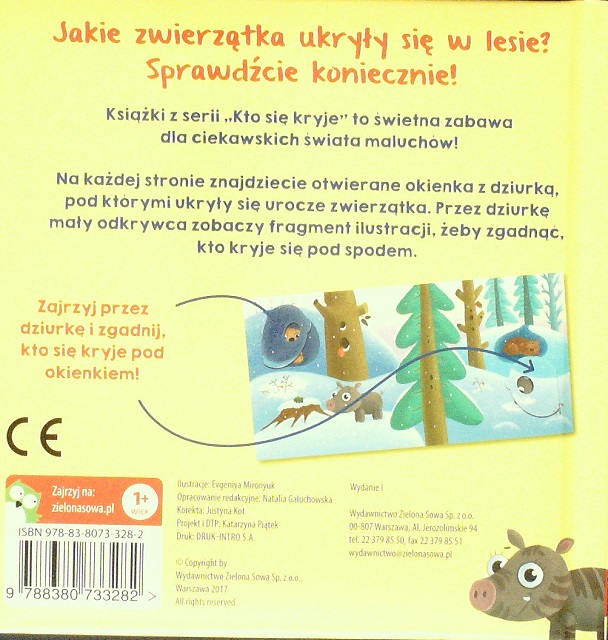Kto się kryje w lesie / il. Evgeniya Mironyuk. - Warszawa : Wydawnictwo Zielona Sowa Sp. z o.o., 2017. - [10] s. : il. kolor. ; 17x17 cm.
