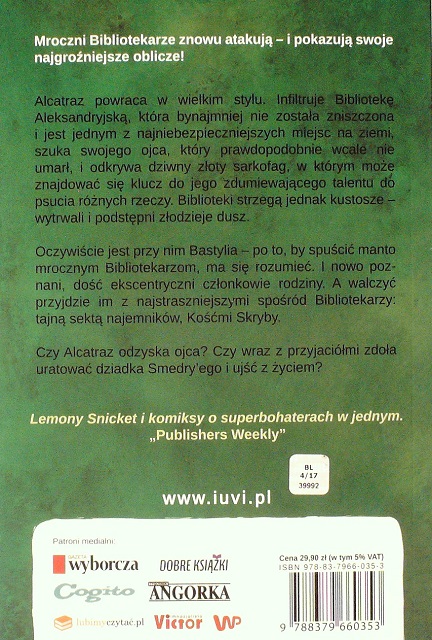 Właściwie to Brandon Sanderson wcale nie napisał tej powieści. Jej autorem tak naprawdę jest sam główny bohater, Alcatraz Smedry. I to on przestrzega nas przed Bibliotekarzami, którzy rządzą światem. Nie dajcie się zwieść ich sztuczkom! Fałszują historię i naukę, ukrywają prawdziwe fakty. To przez nich książka ta musiała być wydana jako fantastyczna, podczas gdy przecież w rzeczywistości jest autobiografią. Alcatraz chce nam uświadomić, byśmy nie wierzyli we wszystko, co słyszymy.