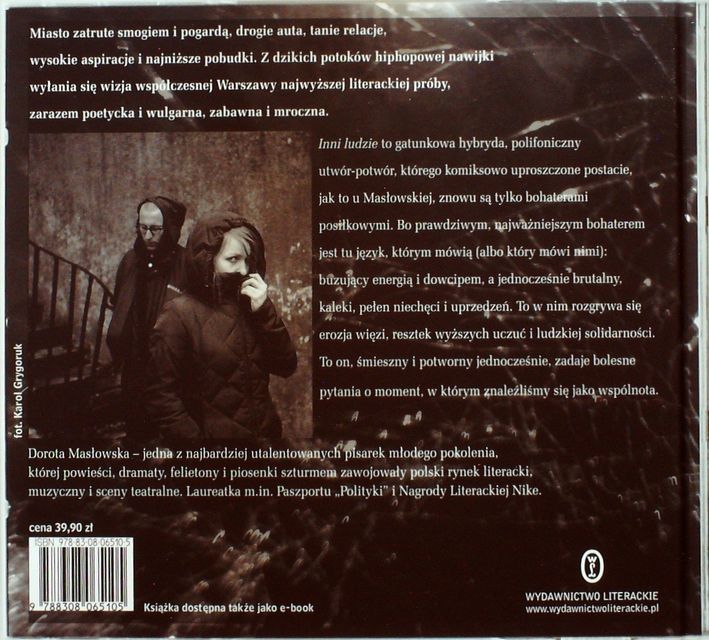 „Inni ludzie” to w jakimś stopniu książka widmowa, gdzie ludzie to karykatury samych siebie. Czytamy o rozległych pasmach pustki, wypełnianej skrzętnie dopalaczem. O pozorach, za którymi życie staje się cieniem własnego ogona. O niebie koloru poloneza. Ludzie w tym świecie są próżni i otępiali. Ich rzeczywistość to świat chorych formatów. Masłowska rozmontowuje kalki i klisze poznawcze. Jej transowa proza to ballada o niedoli, której rusztowaniem jest wieprzowina języka z dyskontowej przeceny. To poemat o ściganiu się z własnymi marzeniami, o ludziach, których biografię gdzieś po drodze zagubiło życie. „W głowie / samotność tak wielka, jakby przez morze płynął puszką”.
