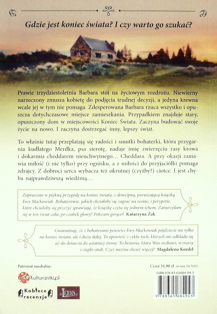 Prawie trzydziestoletnia Barbara stoi na życiowym rozdrożu. Niewierny narzeczony zmusza kobietę do podjęcia trudnej decyzji, a jedyna krewna wcale jej w tym nie pomaga. Zdesperowana rzuca wszystko i opuszcza dotychczasowe miejsce zamieszkania. Przypadkiem znajduje stary, opuszczony dom w miejscowości Koniec Świata. Zaczyna budować swoje życie na nowo. I zaczyna dostrzegać inny, lepszy świat. To właśnie tutaj przeplatają się radości i smutki bohaterki, która przygarnia kudłatego Merdka, psa sierotę, nadaje imię zwierzęciu rasy krowa i dokarmia cheddarem nieuchwytnego… Cheddara. A przy okazji zamawia miłość (i nie tylko) przy ognisku, a z miłości do przyjaciółki pomaga zdrajcy. Z dobroci serca wybacza też okrutnej (czyżby?) ciotce.