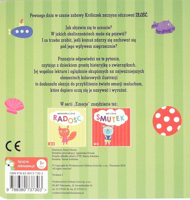 Króliczek czuje złość / [ilustracje Anna Zboina]. - Warszawa : Wydawnictwo Zielona Sowa, 2018. - [12] stron : ilustracje kolorowe ; 19 x 19 cm.