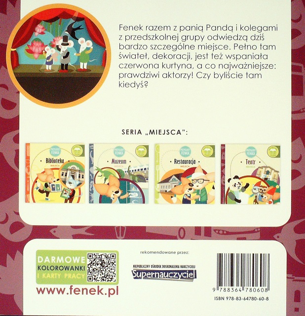 Teatr / tekst Magdalena Gruca ; ilustracje Ewa Zontek. - Bielsko-Biała : Wydawnictwo Edukacyjne Sobik, 2018. - [20] stron : ilustracje kolorowe ; 22 x 22 cm.