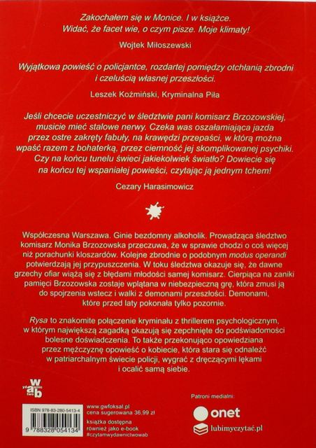 Jak już pisałam na początku czyta się ją dość ciężko, ale po przyzwyczajeniu się do sposobu pisania autora, uważam że ,,Rysa" to bardzo dobra książka. Wiem że jest drugi tom przygód komisarz Brzozowskiej, i już nie mogę się doczekać kiedy po nią sięgnę.