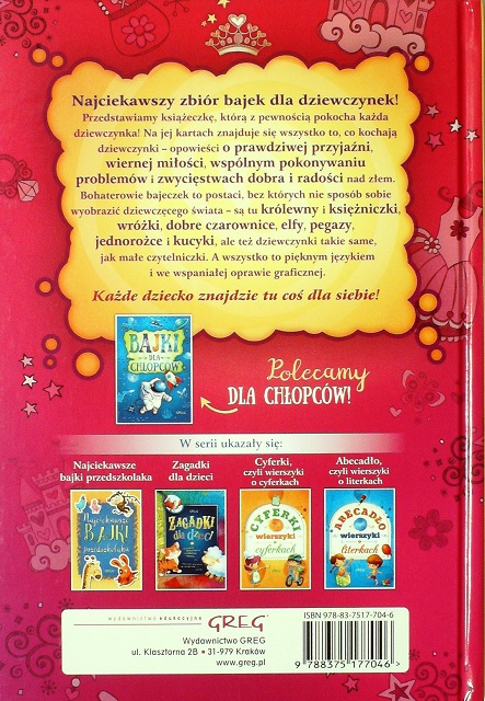 Bajki dla dziewczynek / [Małgorzata Białek]. - Kraków : Wydawnictwo GREG, [2018]. - 61, [1] strona : ilustracje kolorowe ; 26 cm.