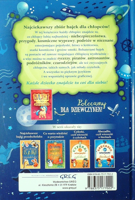 Bajki dla chłopców / [Małgorzata Białek]. - Kraków : Wydawnictwo GREG, [2018]. - 61, [1] strona : ilustracje kolorowe ; 26 cm.