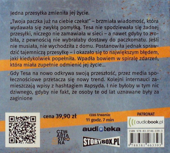 Niemniej jednak postanawia pojechać odebrać przesyłkę. W domu, gdy otwarta paczkę niesamowicie się zdziwiła jej zawartością, gdyż była tam ametystowa czaszka oraz kartka z jej imieniem i hashtagiem apsyda. Małżonkowie usiłują rozszyfrować, co to oznacza. Z czasem wpadają na pewien trop. Pod tym hashtagiem zaczynają pojawiać się posty z kont osób zaginionych oraz zmarłych. Sytuacja zaczyna się wytykać spod kontroli. W tajemnicy przed mężem Tesa postanawia skontaktować się ze Strachem, z którym kilka lat wcześniej zerwała kontakt. W międzyczasie kobietą dostaje kolejnego smsa z informacją o oczekujące na nią paczce. Po powrocie do domu dowiaduje się, że jej mąż zaginął. Tesa nie wie, co ma zrobić. Kierowana intuicja kontaktuje się ponownie ż byłym wykładowcą. Nagle sprawą zaczyna się interesować policja oraz media. Jak po nitce do kłębka wszystko wiąże się z Tesą, która wkrótce zostaje oskarżona o porwania i zabójstwa. Ukrywa się u Stracha. Bohaterka ma wrażenie jakby żyła w innym świecie, niektóre fakty z przeszłości zacierają się z rzeczywistością.