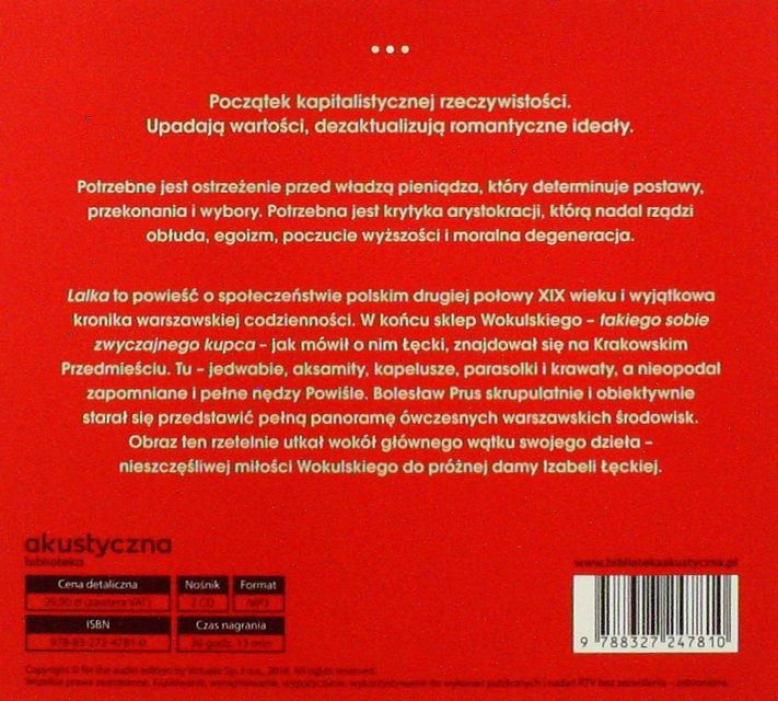 Lalka / Bolesław Prus ; czyta Filip Kosior. - Warszawa : Biblioteka Akustyczna, 2018. - 2 płyty audio CD (30 godz. 13 min) : digital, stereo ; 12 cm.